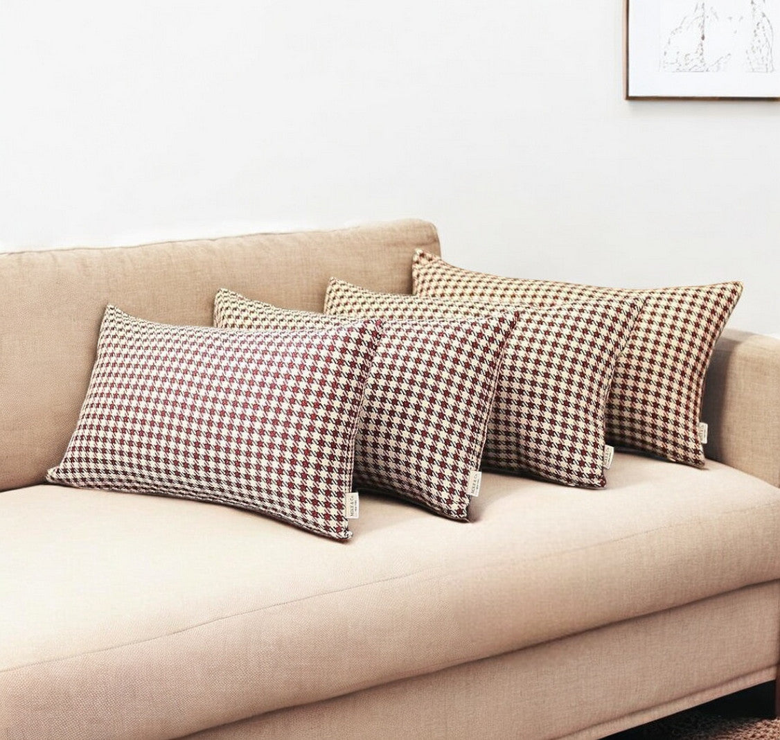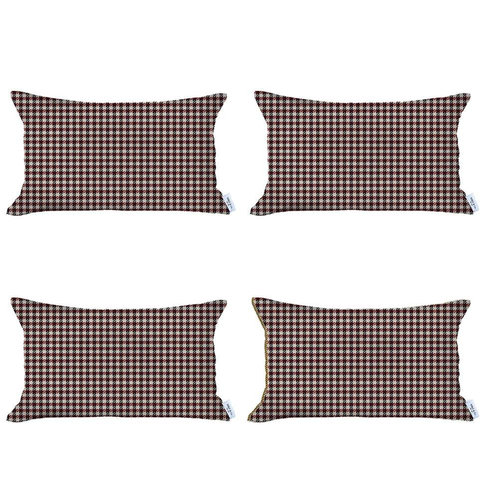Upholding a rich and luxurious vibe, this Set of 4 Red Houndstooth Lumbar Pillow Covers will be a sophisticated addition to any modern or contemporary setting. Featuring the classy houndstooth checkered pattern in black and maroon red over a cream-toned base, each cover accentuates an elegant combination. Flaunting the creativity of Turkish artisans, these pillow covers are handmade of OEKO-TEX Standard 100 certified polyester fabric to ensure quality and product safety that will last for ages with low maintenance. The hidden zipper closure adds to a smooth finish for a soft and sumptuous feel on the touch. Besides serving as a sophisticated accent to complement any furniture, this set of lumbar pillow covers will enrich the ambiance of any modern or contemporary living space. 12” x 20” each. Set of 4.